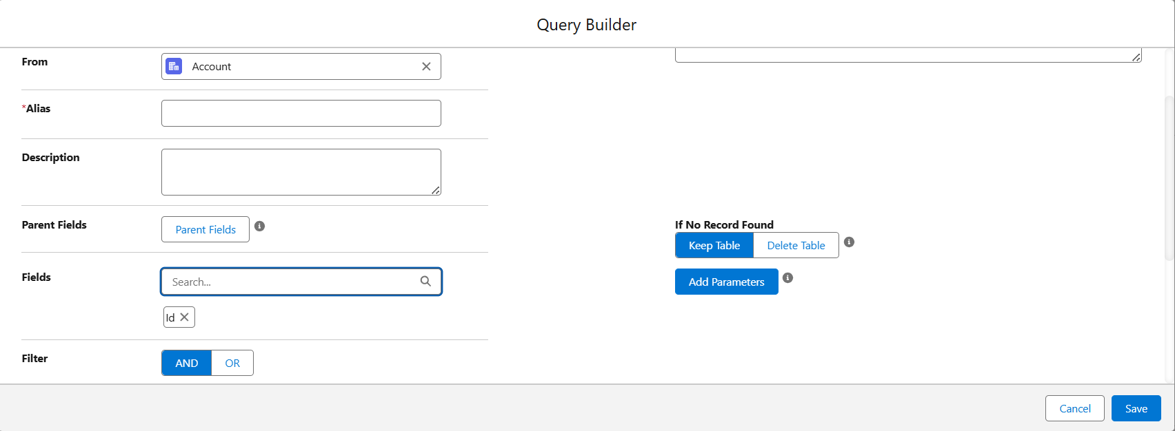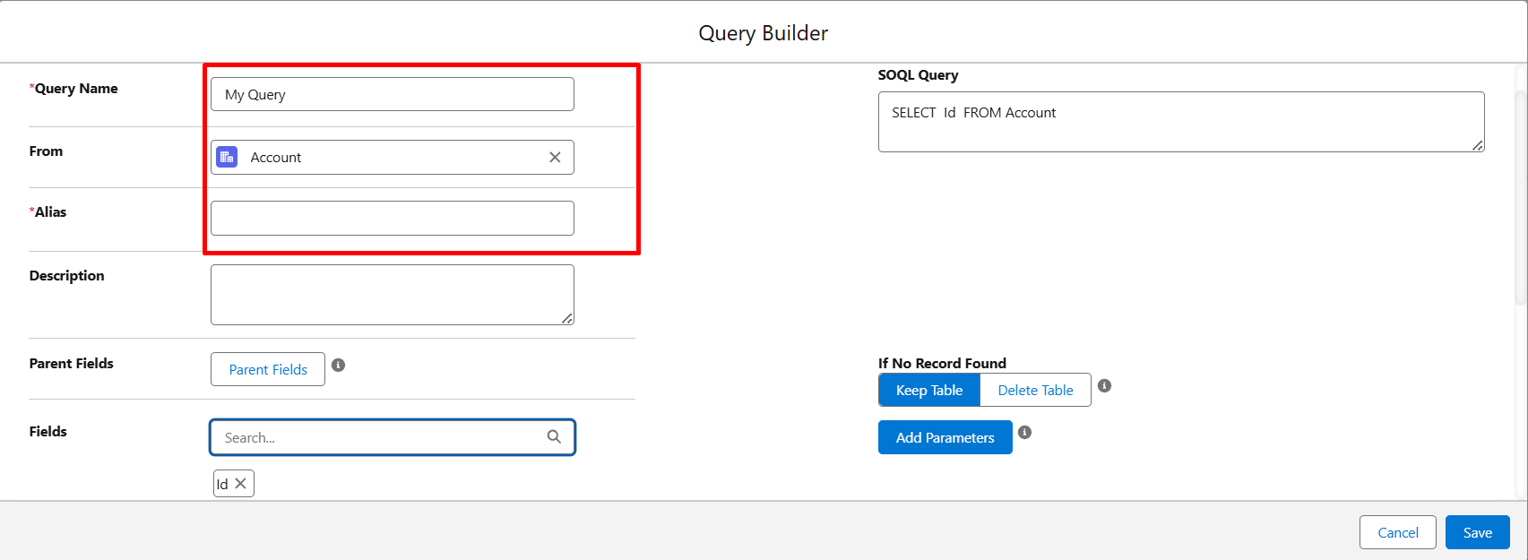Step 3: Give your SOQL query a name and select the object you want to fetch data from, e.g., (Account), and give an Alias to it. You can also give some relevant description to your query, like the purpose of the query or what type of data it is fetching.