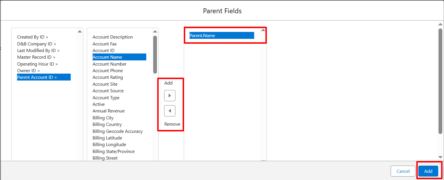 Step 5: You can also select the parent fields, like Parent Account or Account in the case of Contacts, by clicking on the Parent Fields Button.