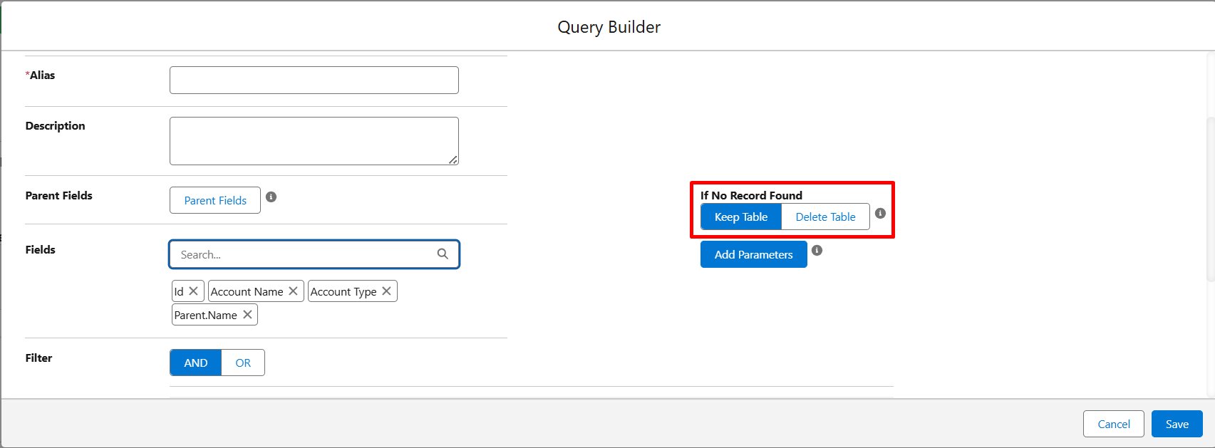 Step 7: From the Query builder, you can control whether a table should be visible or kept hidden in case there are no records. You can click on Keep Table and Delete Table as per the requirements.