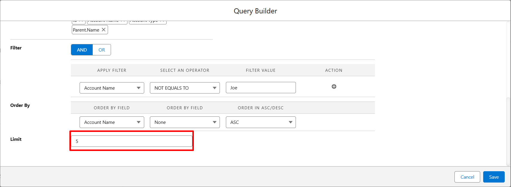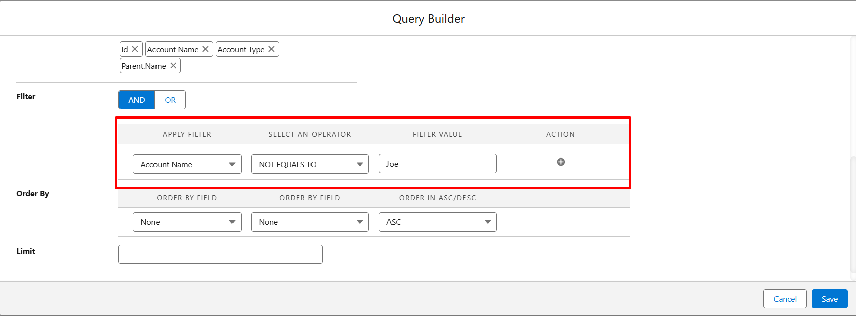 Step 8: If you want to add any filters to your query, you can set them from the filter section and choose the filter condition, e.g., AccountName equals Joe.