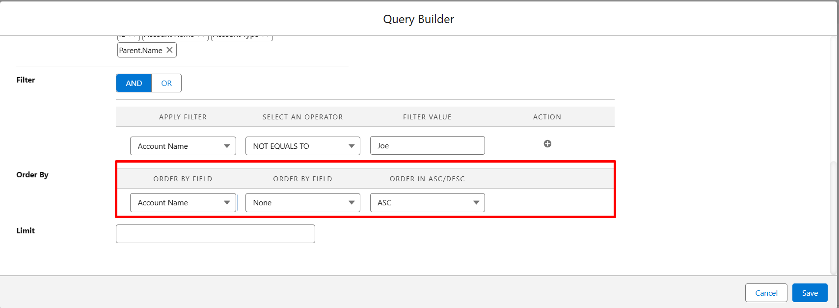 Step 9: You can also set the Order By condition in your queries from the Order By Section, e.g., Order By- Account, None, or ASC.