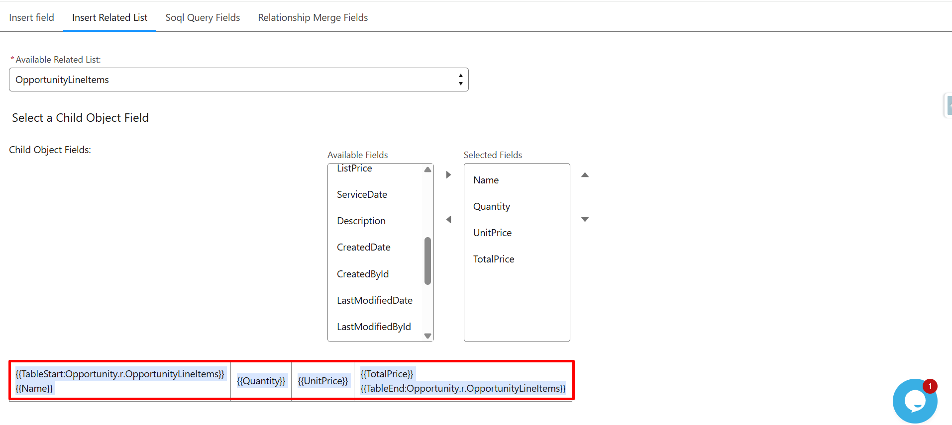 The system automatically generates the merge field syntax: