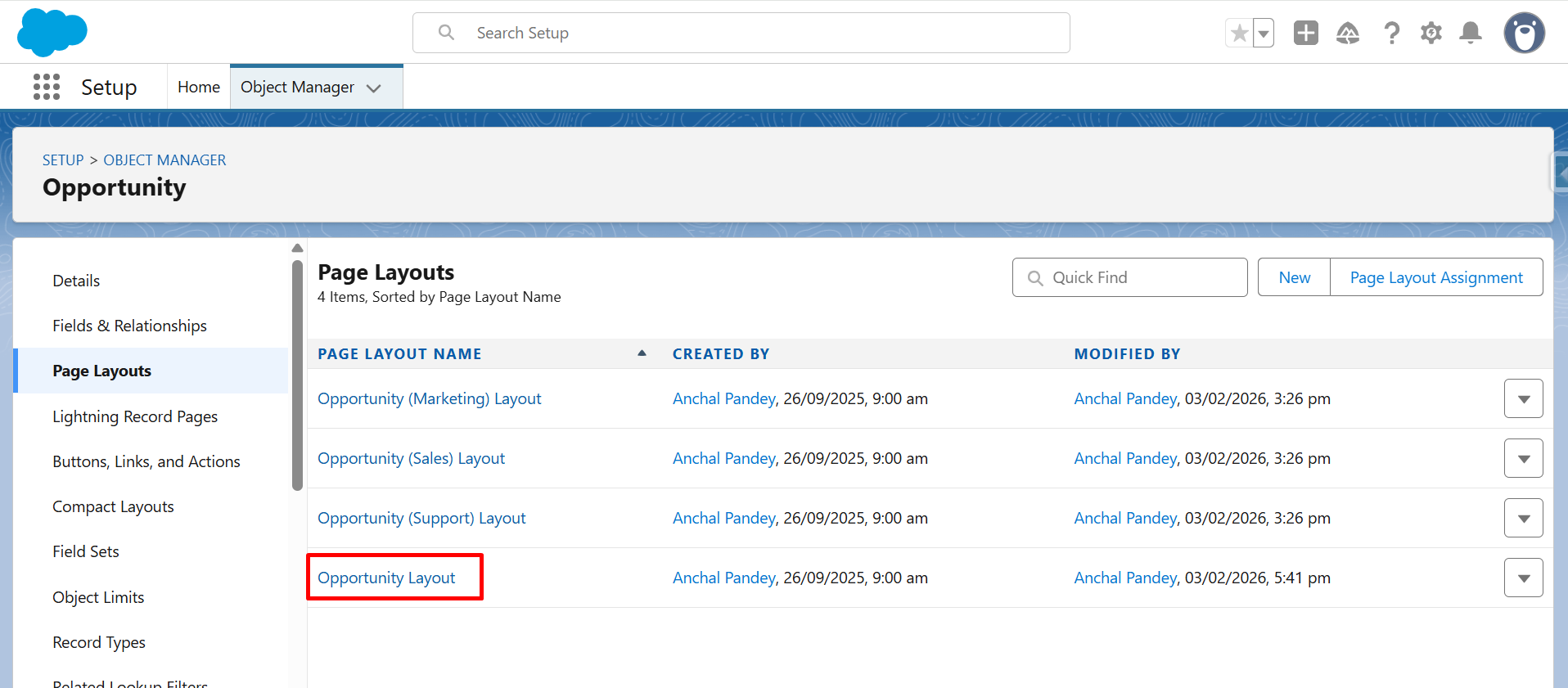 Step 18: From the list, click Opportunity Layout (as we have selected Opportunity as Salesforce object) to customize the record page.
