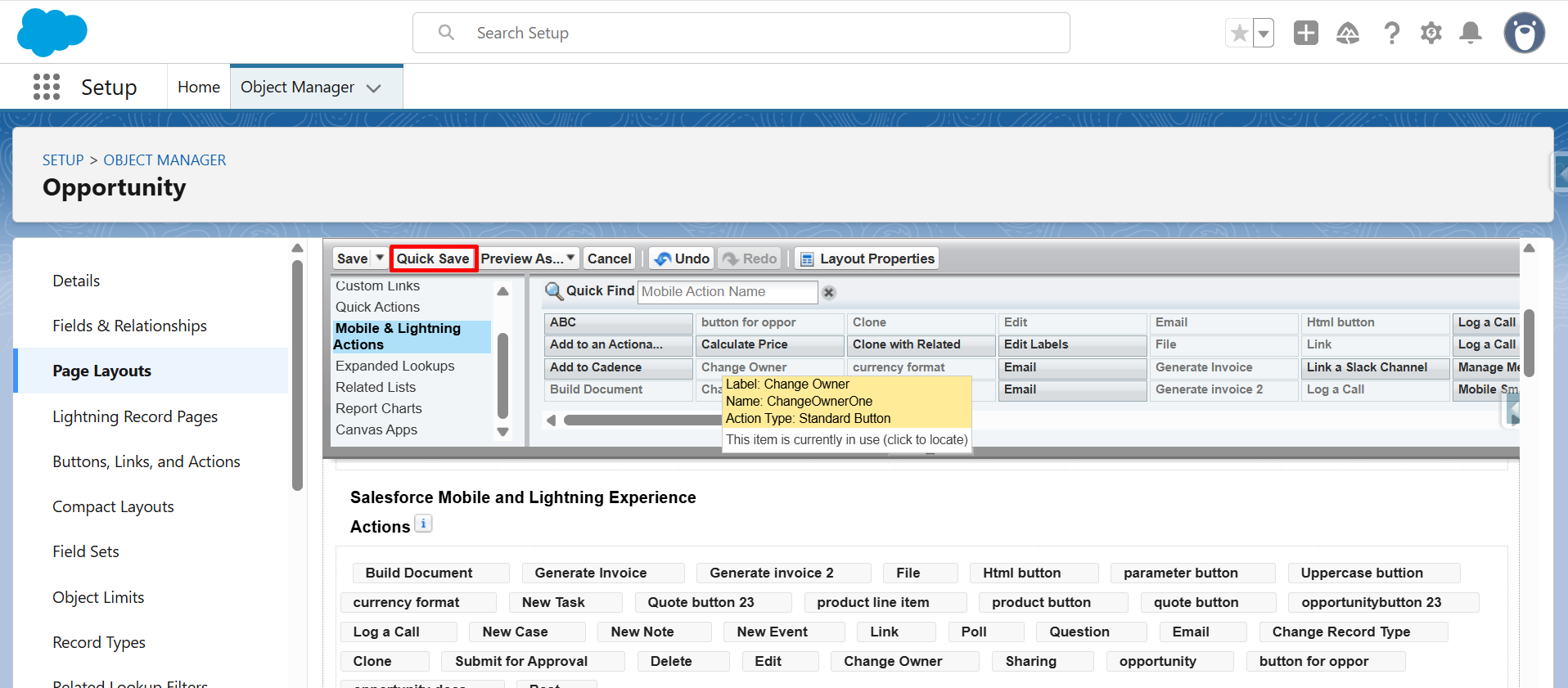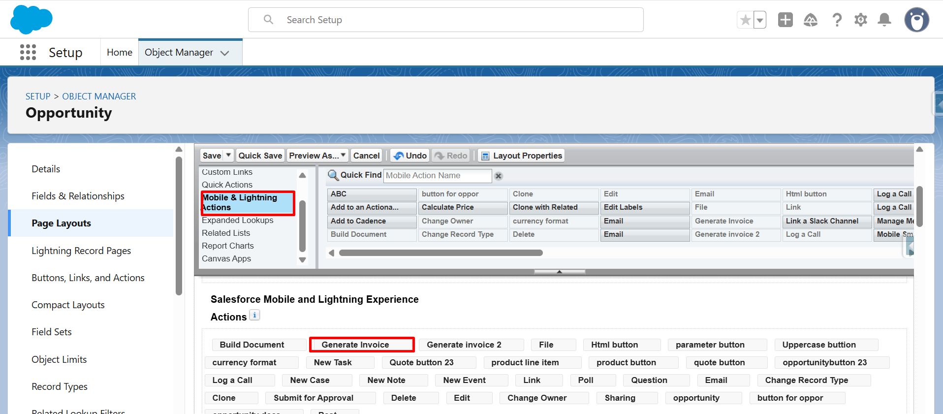 Step 19: Now, from Mobile & Lightning Actions, drag and drop Generate Invoice into Salesforce Mobile and Lightning Experience Actions.