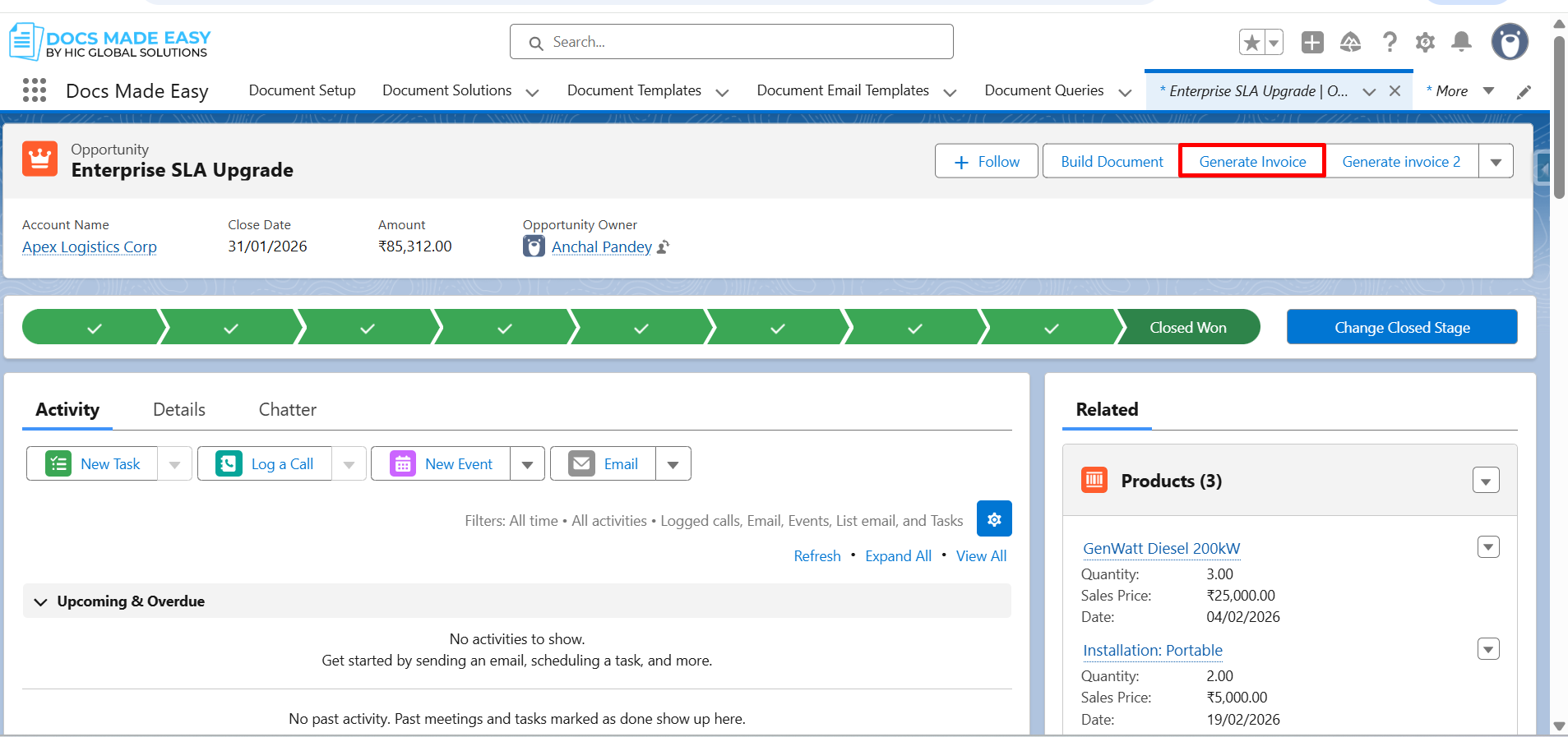 Step 21: Next, open an Opportunity record and click the Generate Invoice button.