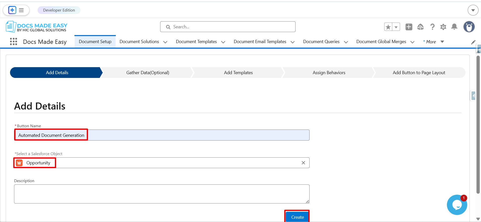 Step 4: Enter the button name, select the Salesforce object (Opportunity), and then click on Create.