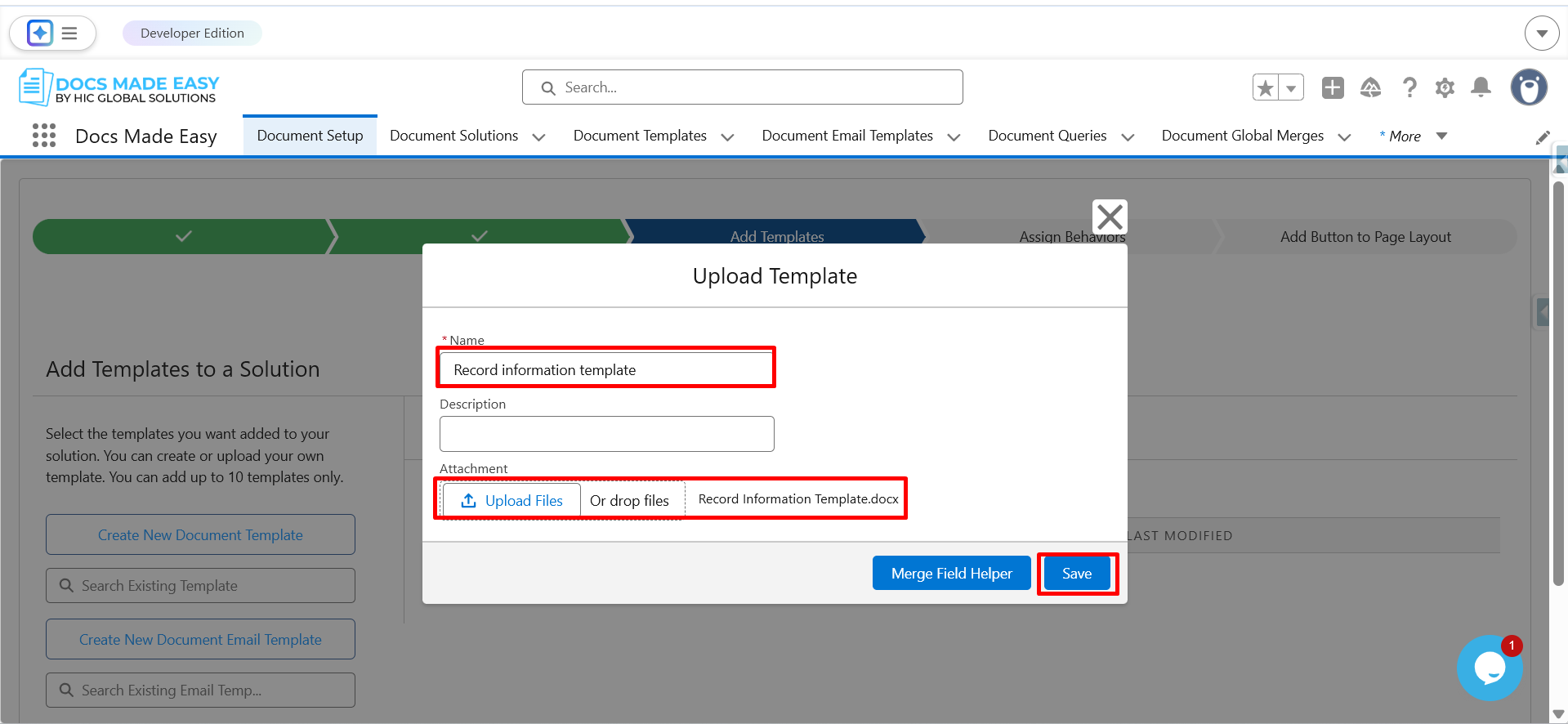Step 7: Enter the template name, upload the template file, and click on Save.