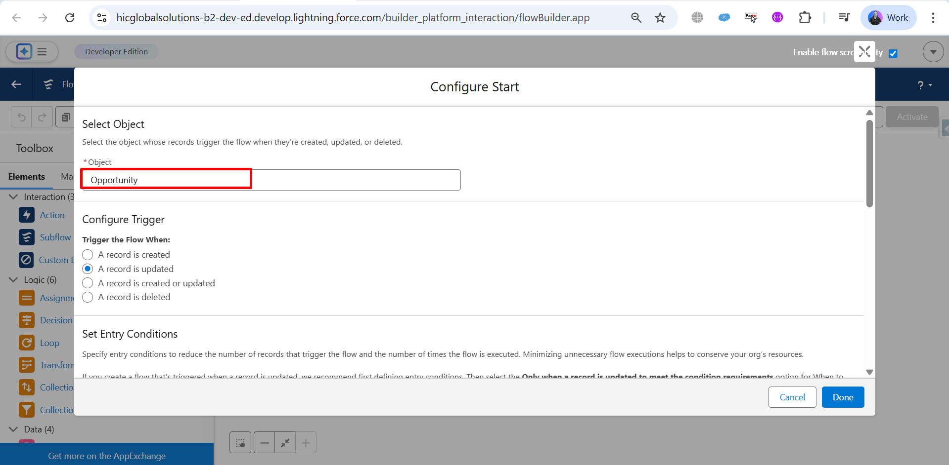 Step 13: Select the Salesforce object (Opportunity) and configure a trigger to trigger the flow when a specific event occurs (like A record is updated).