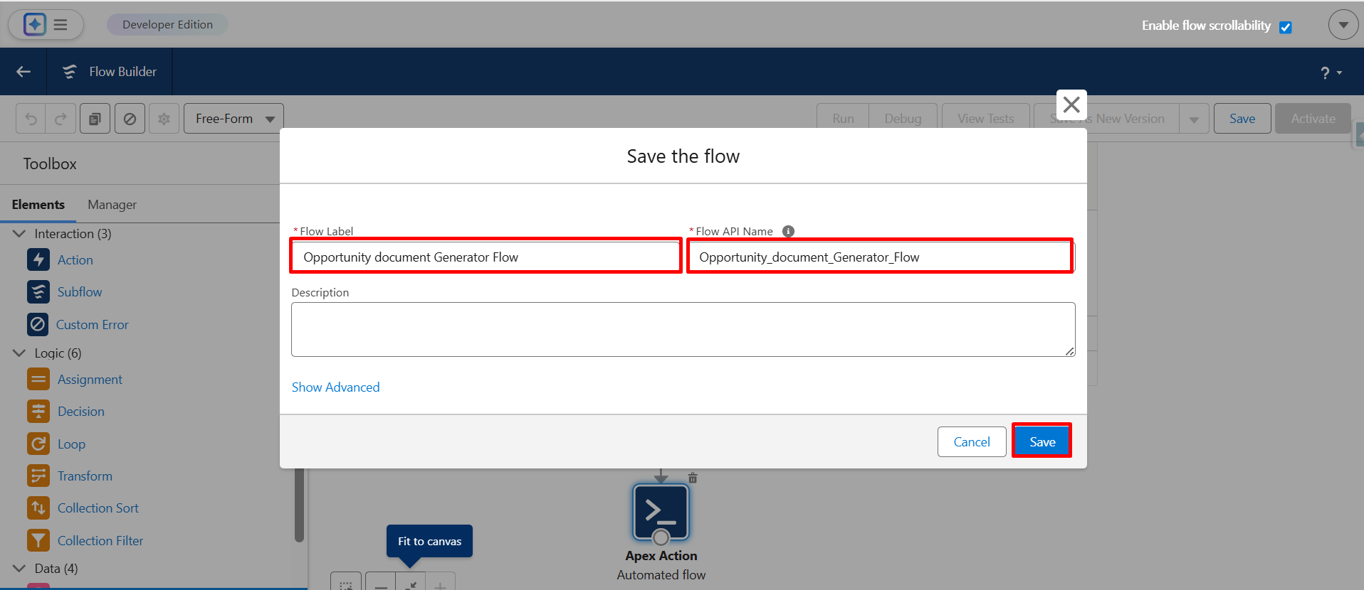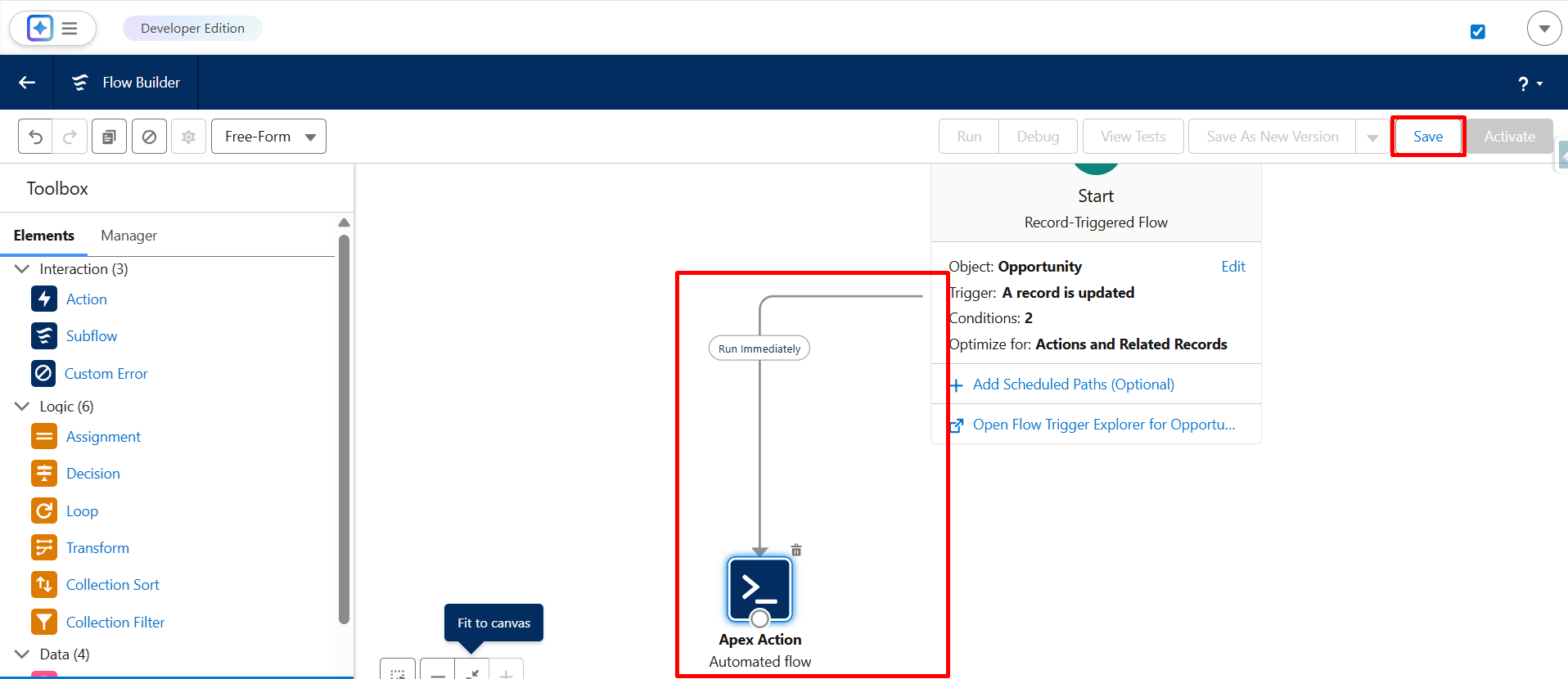 Step 21: Connect the flow and Apex Action properly, and then click on Save.