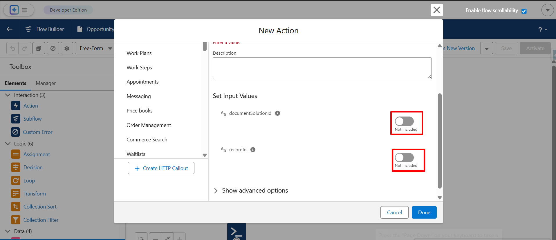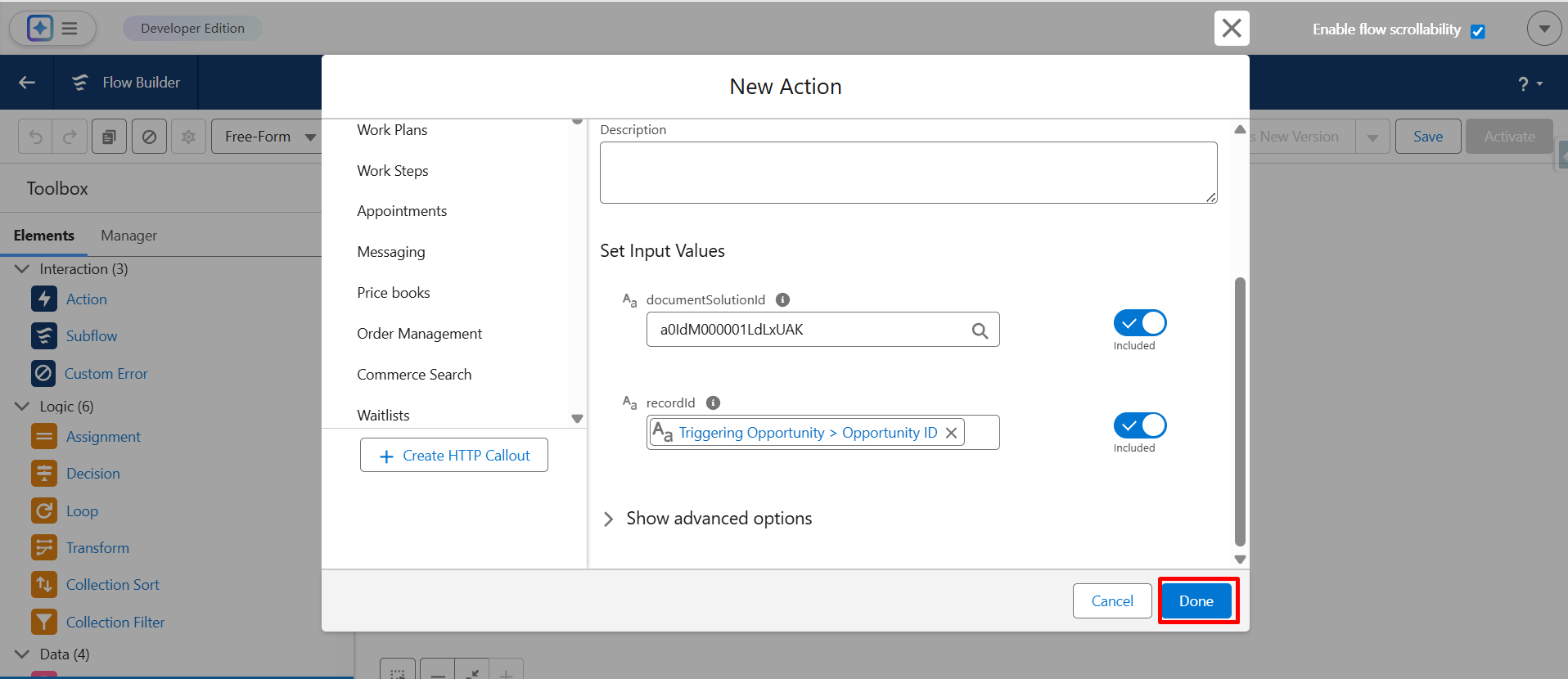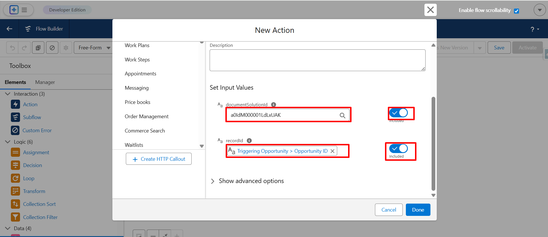 Step 19: Enter the Document Solution ID and the Record ID so the system knows which record to generate the document for.