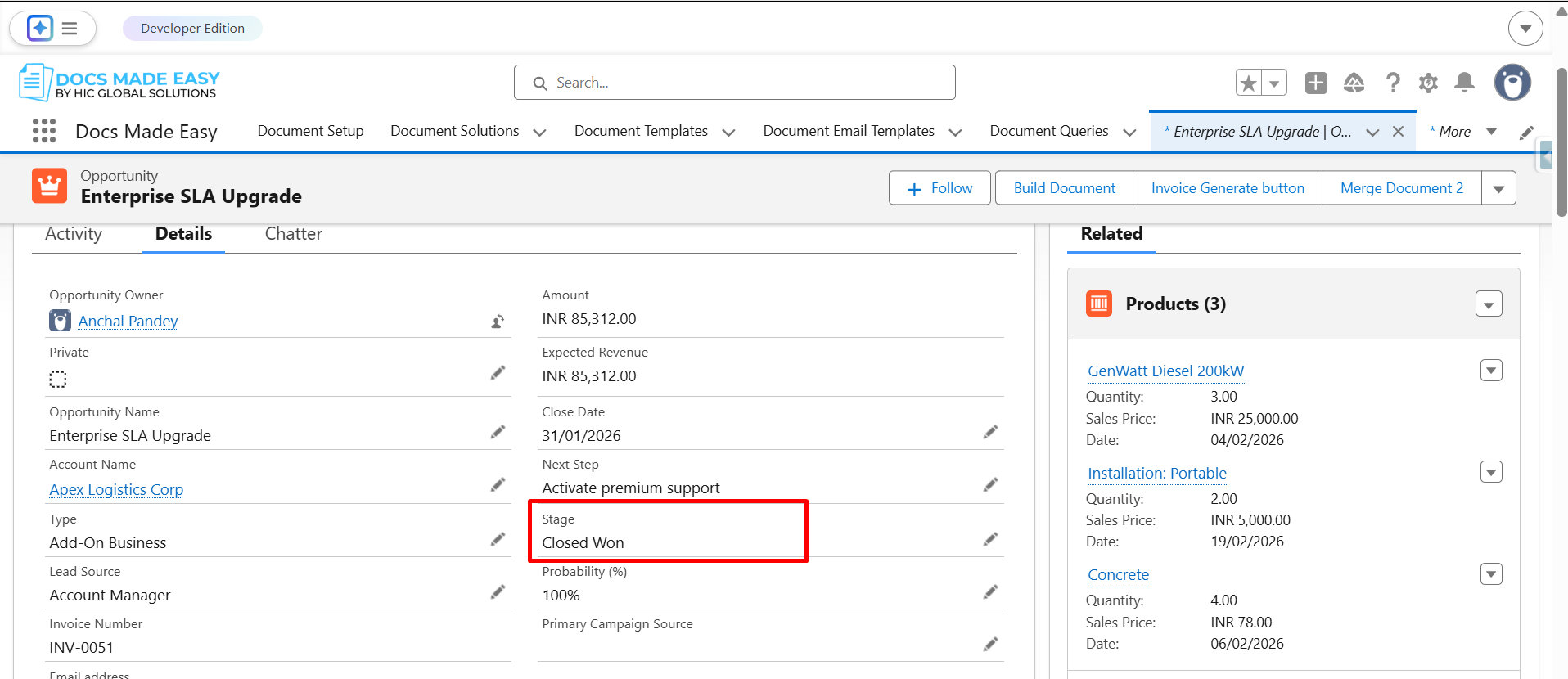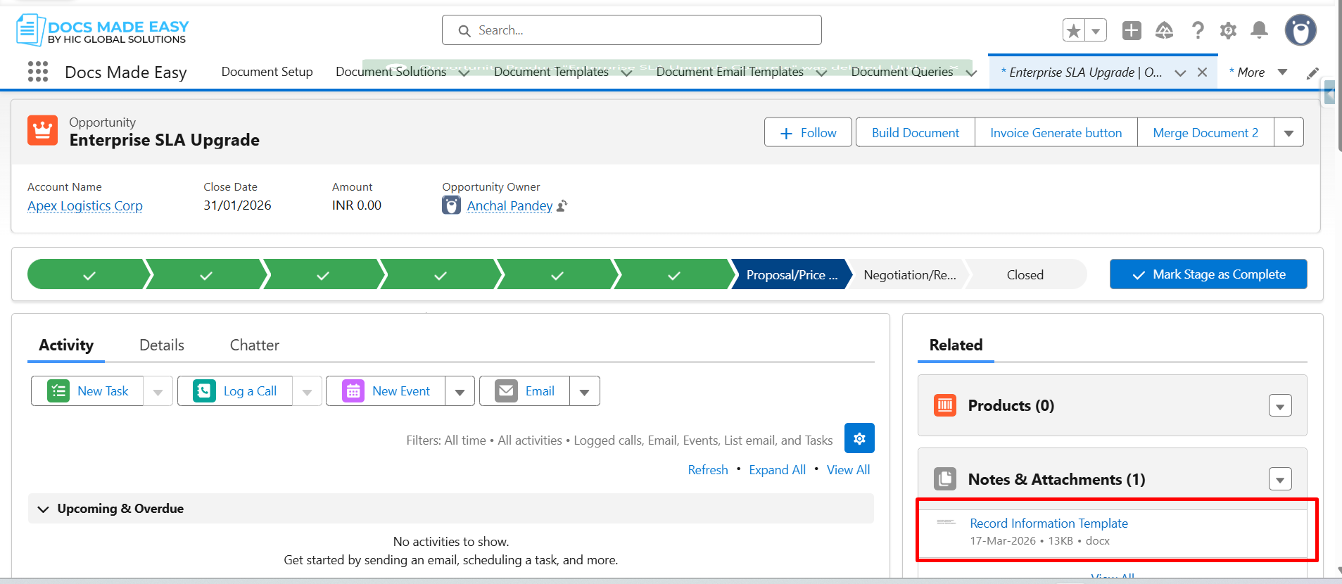 Step 25: Once the record is saved, the generated document will automatically appear in the Related (Notes & Attachments) section.