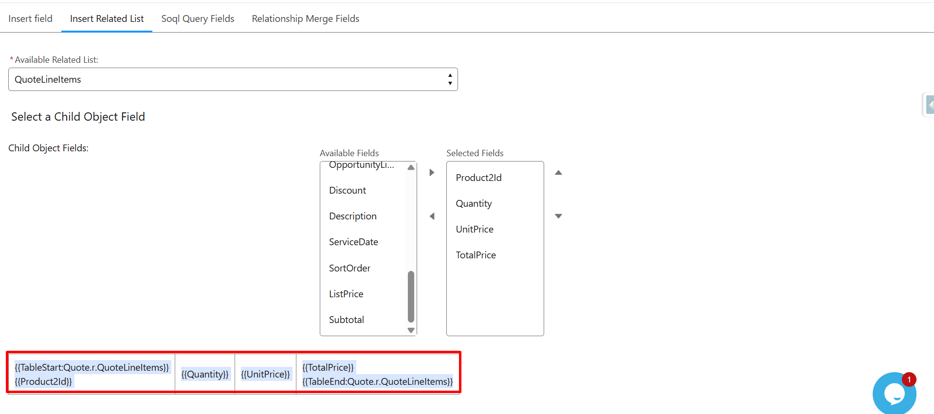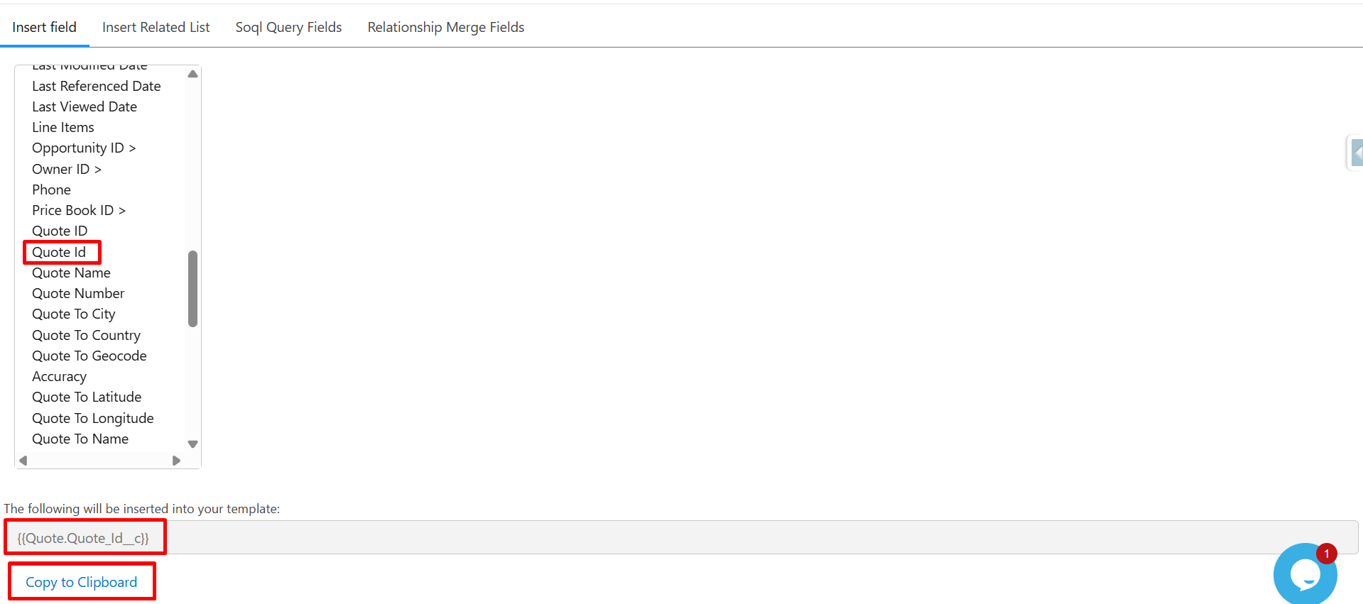 The system will auto-generate the merge field syntax: {{Quote.Quote_Id_c}}