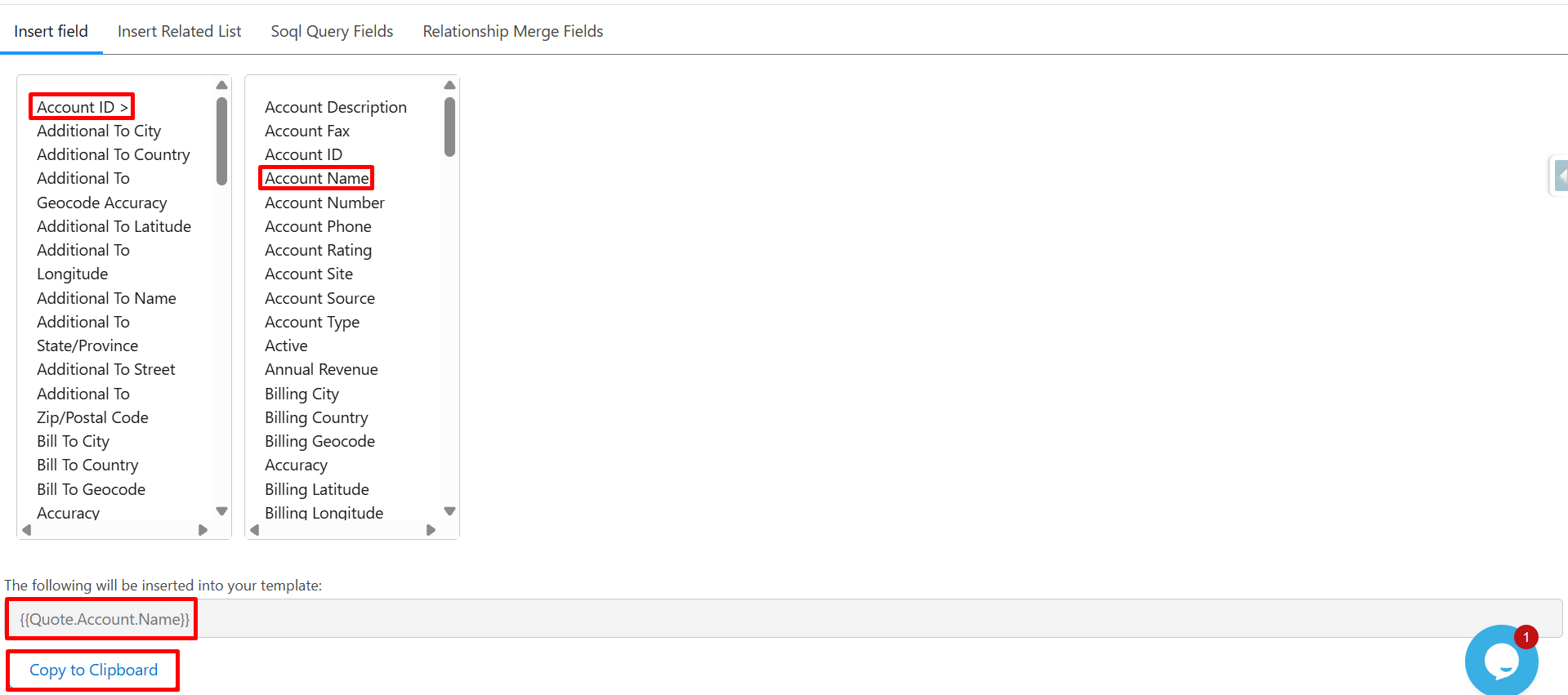 The merge field syntax will automatically appear; click Copy to Clipboard.