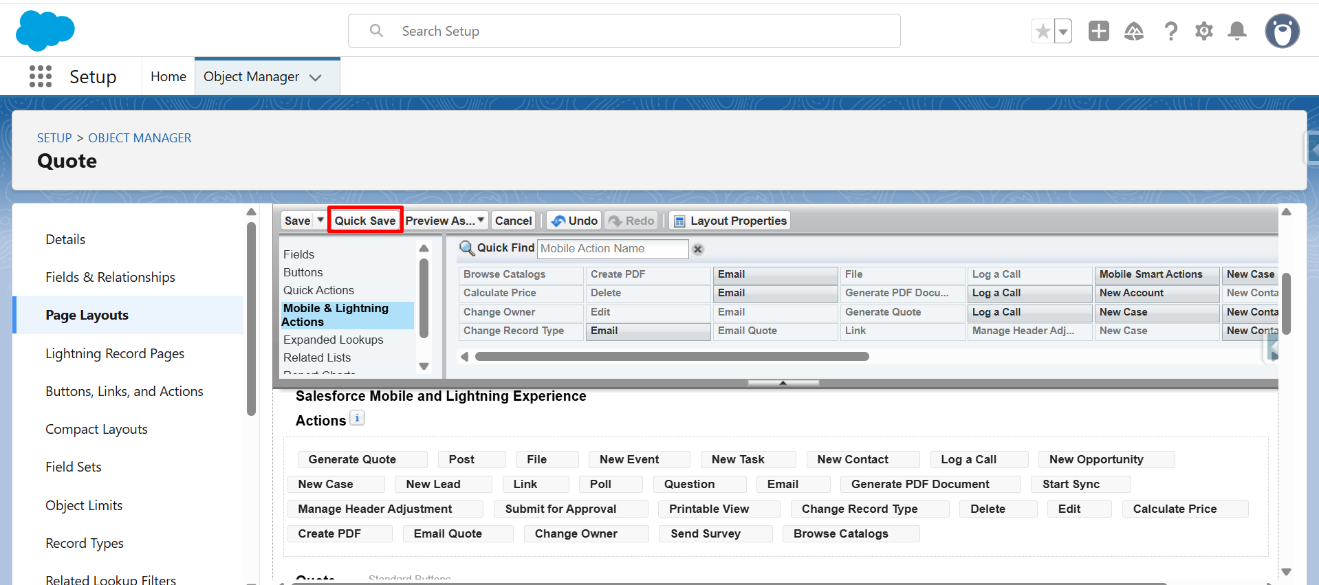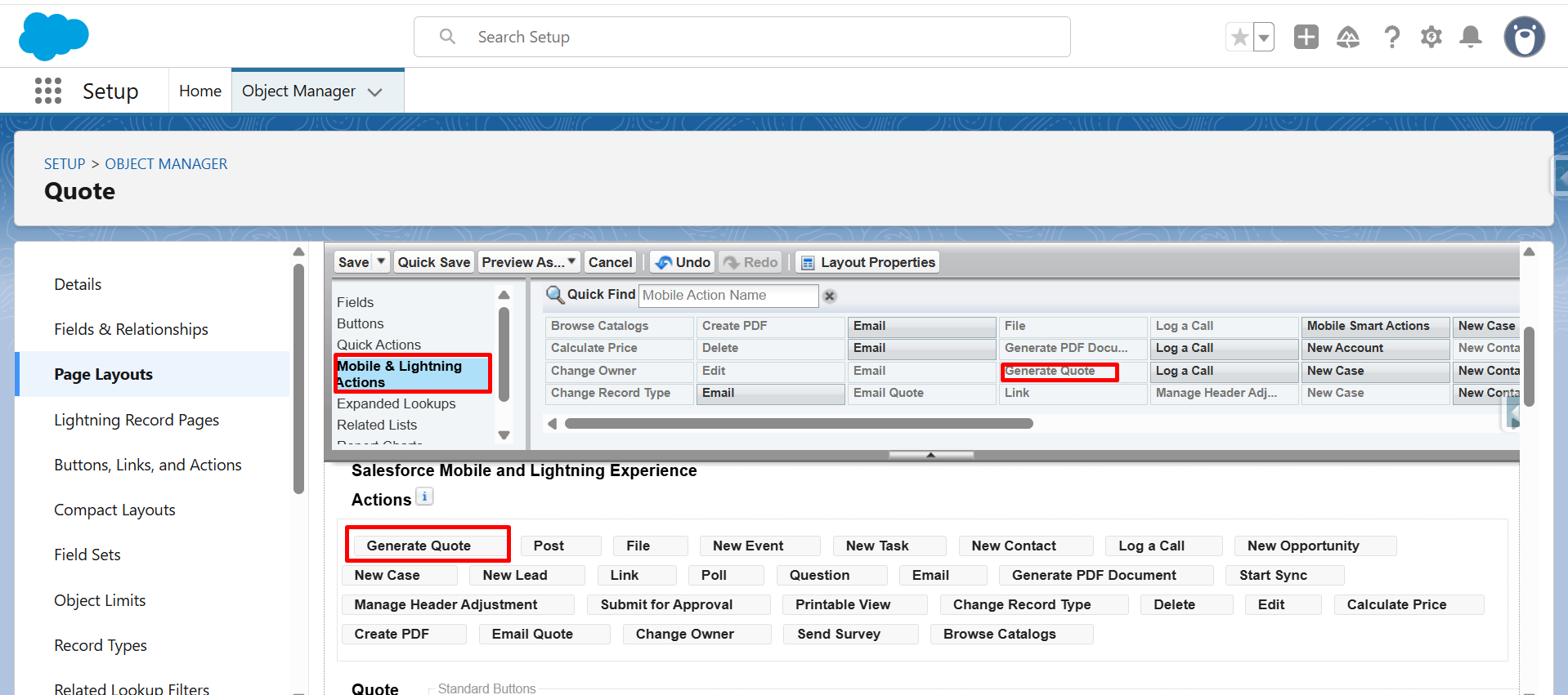 Step 17: From Mobile & Lightning Actions, drag and drop the Generate Quote button in Salesforce Mobile and Lightning Experience Actions.
