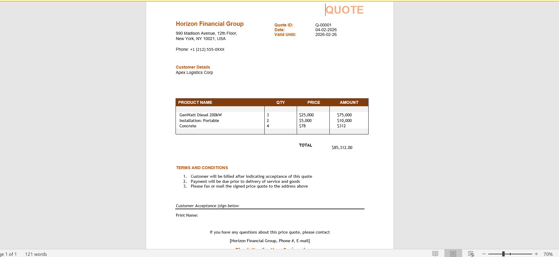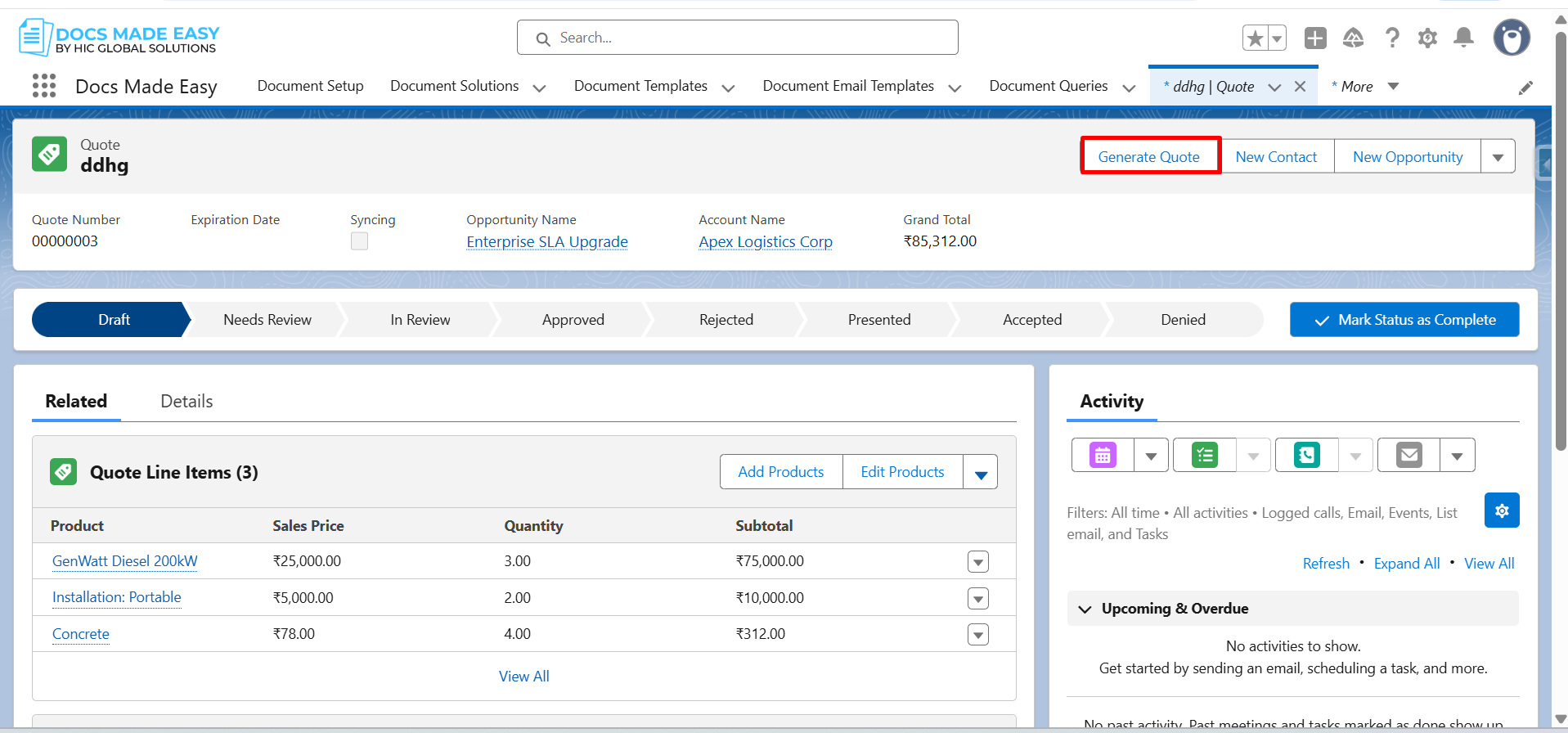 Step 19: Go to Quote Record and click on the button (Generate Quote).